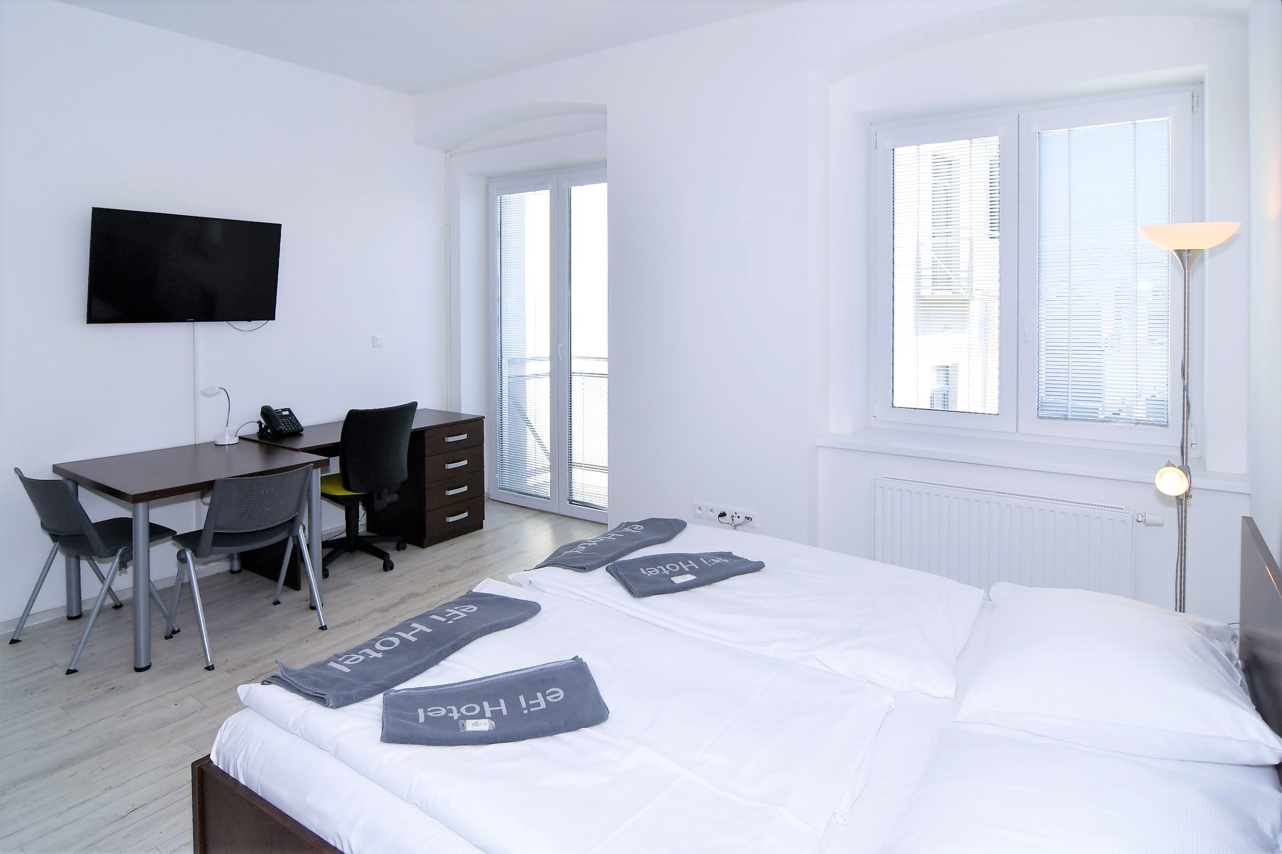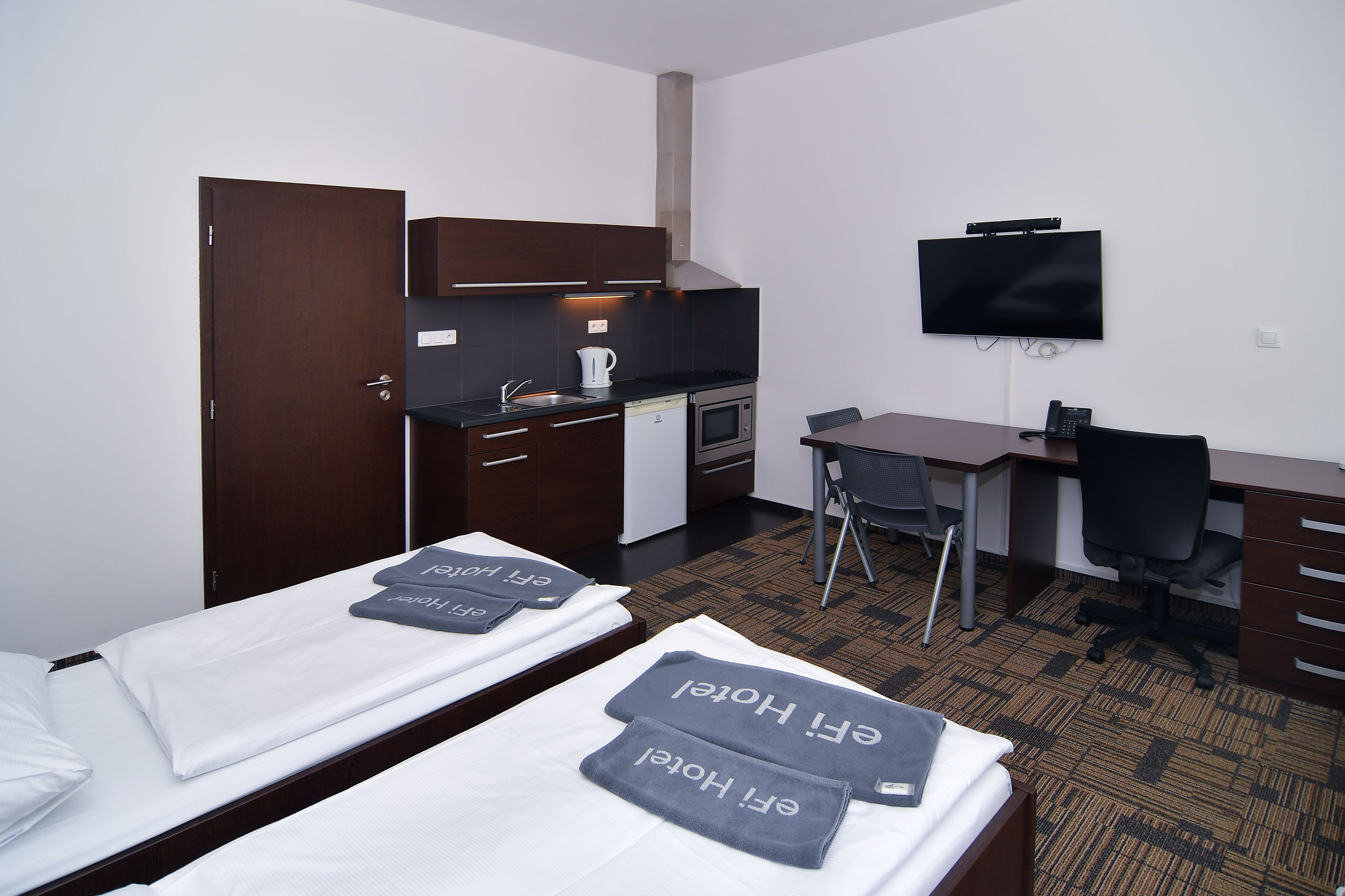 Pro studijní i pracovní pobyty nabízíme pronájem plně zařízeného bytu 1+kk včetně kuchyňské linky a elektrospotřebičů v hotelovém komplexu eFi Palace Hotel v centru Brna. V rámci uzavřeného hotelového komplexu Vám bude k dispozici také fitness, wellness, restaurace, venkovní bazén a parkování na hlídaném parkovišti. Pronájem bytu je možný od dvou měsíců až na dobu jednoho roku. Nájemcem může být fyzická osoba či firma. Odjíždíte na léto domů? Nevadí, byt uvolníte na letní období, ve kterém nebudete nic platit, a od podzimu se můžete znovu nastěhovat do stejného bytu. Byty 1+kk jsou o výměře od 26 do 38 m2 m2 a nacházejí se ve 2.-5. podlaží. Budova je opatřena výtahem i schodištěm. Jednotka je vybavena klimatizační jednotkou značky Samsung včetně dálkového ovládání. Byt má vstupní chodbu vybavenou vysokou šatní skříní s celoplošným zrcadlem a pokojovým trezorem. Dále byt disponuje obývací částí s komfortními postelemi 90 x 200 cm, moderní vybavenou kuchyňskou linkou s pracovní deskou, podstavnou lednicí Indesit, vestavěnou mikrovlnou trouba s grilem a horkovzdušnou troubou, varnou konvicí a jídelní soupravou s nádobím pro 2 osoby. Pokoj je vybavený jídelním stolem se 2 židlemi, pracovním stolem s kancelářskou židlí a smart TV. Koupelna je s buď s vanou, nebo sprchovým koutem, umyvadlem, wc a topným žebříkem. WiFi připojení se standardní rychlostí dat je již v ceně pronájmu. K ceně měsíčního nájmu je nutné započíst i cenu za odběr elektřiny, vody a topení. Cena měsíčního nájmu zahrnuje úklid společných prostor a pronájem povlečení s jejich výměnou v rozsahu jedenkrát měsíčně. Možnost pronájmu parkovacího stání v areálu komplexu je za 1 904 Kč měsíčně. Možnost pronájmu pračky umístěné v bytě za 605 Kč měsíčně. Je požadovaná vratná kauce ve výši dvou měsíčních nájmů. Dlouhodobě ubytovaní nájemci mají v komplexu eFi Palace Hotelu zvýhodněný vstup do hotelového wellness a fitness centra. Nabídka je vhodná pro pracovní či studijní pobyty, a to zejména pro oborové specialisty, vytížené vedoucí pracovníky, obchodní zástupce, podnikatelé či studenty vysokých škol. Skvělá dostupnost do centra Brna za necelých 10 minut pěší chůze nebo dvě zastávky MHD. Prohlídky bytů možné kdykoli po předchozí domluvě. Neplatíte provizi za zprostředkování pronájmu!